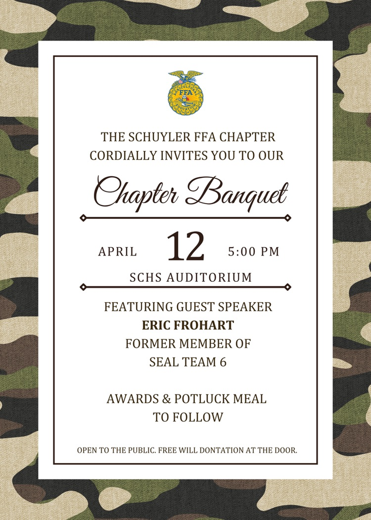 Join us as we recognize and celebrate the hard work of our members, hear from guest speaking Eric Frohart, and install the 2026-2027 chapter officer team during the annual Schuyler FFA Chapter Banquet 💙💛